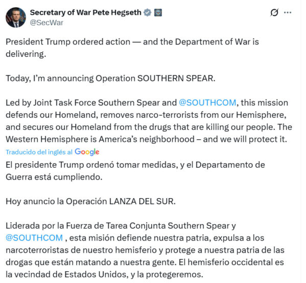 A través de la red social X, dijo: «Hoy anuncio la ‘Operación Lanza del Sur’ (‘South Spear’, en inglés), dirigida por la Fuerza Operativa Conjunta Southern Spear y [el Comando Sur de EE.UU.] SOUTHCOM. Esta misión defiende nuestra patria, elimina a los narcoterroristas de nuestro hemisferio y protege nuestra patria de las drogas que están matando a nuestra gente».