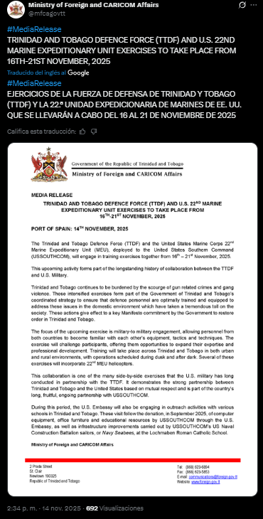 Entre el 16 y el 21 de noviembre del presente año, tropas norteamericanas adscritas al Comando Sur realizarán ejercicios militares conjuntos con las Fuerzas de Defensa de Trinidad y Tobago, como parte de los acuerdos militares entre ambos países.