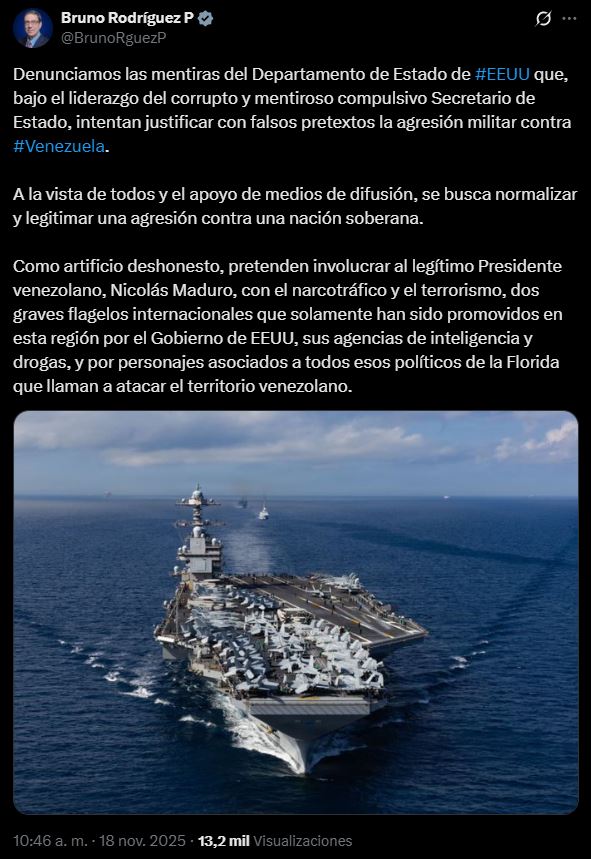 “Denunciamos las mentiras del Departamento de Estado de Estados Unidos que, bajo el liderazgo del corrupto y mentiroso compulsivo Secretario de Estado, intentan justificar con falsos pretextos la agresión militar contra Venezuela”, escribió el alto funcionario cubano.