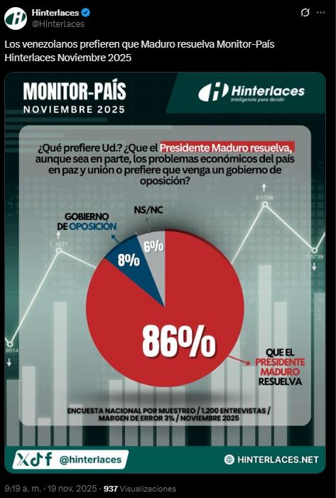 De acuerdo con el más reciente estudio Monitor País de Hinterlaces, el 86% de los venezolanos consultados prefiere que el presidente de la República, Nicolás Maduro, resuelva los problemas económicos del país en paz y unión.