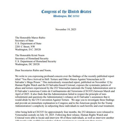 El informe, precisa la misiva dirigida a los funcionarios antes señalados, “expone el patrón sistemático de abuso y tortura sufrido por los 252 ciudadanos venezolanos que la Administración Trump envió al tristemente célebre Centro de Confinamiento del Terrorismo (CECOT) de El Salvador entre marzo y abril de 2025”.