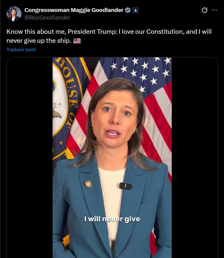 Igualmente, la demócrata Maggie Goodlander envió unas palabras al presidente norteamericano, a través de sus redes sociales. «Que sepa esto sobre mí, presidente Trump: amo nuestra Constitución y jamás la abandonaré», escribió en su cuenta de X, acompañado de un video.