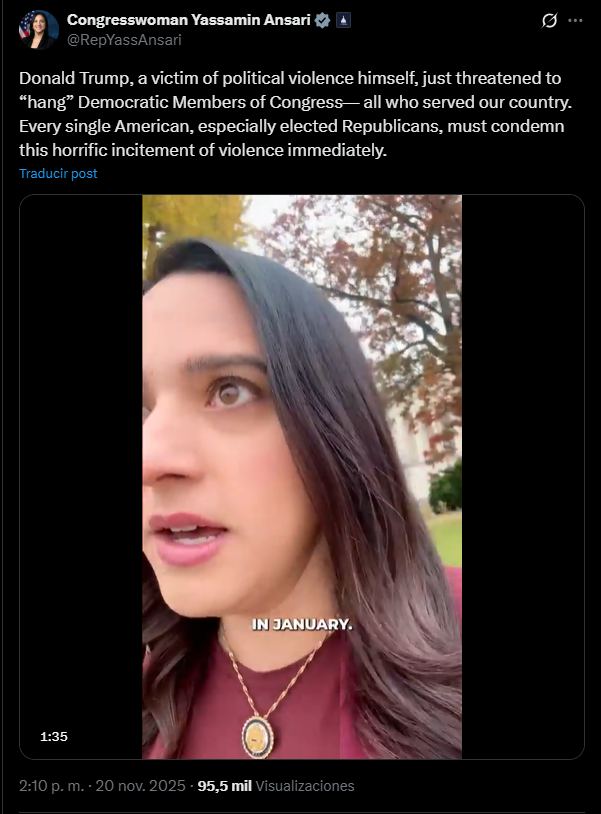 Del mismo modo, la congresista demócrata, Yassamin Ansari, publicó un video en sus redes sociales, en el que señala que toda la población estadounidense debe condenar «de inmediato» las amenazas del mandatario.
