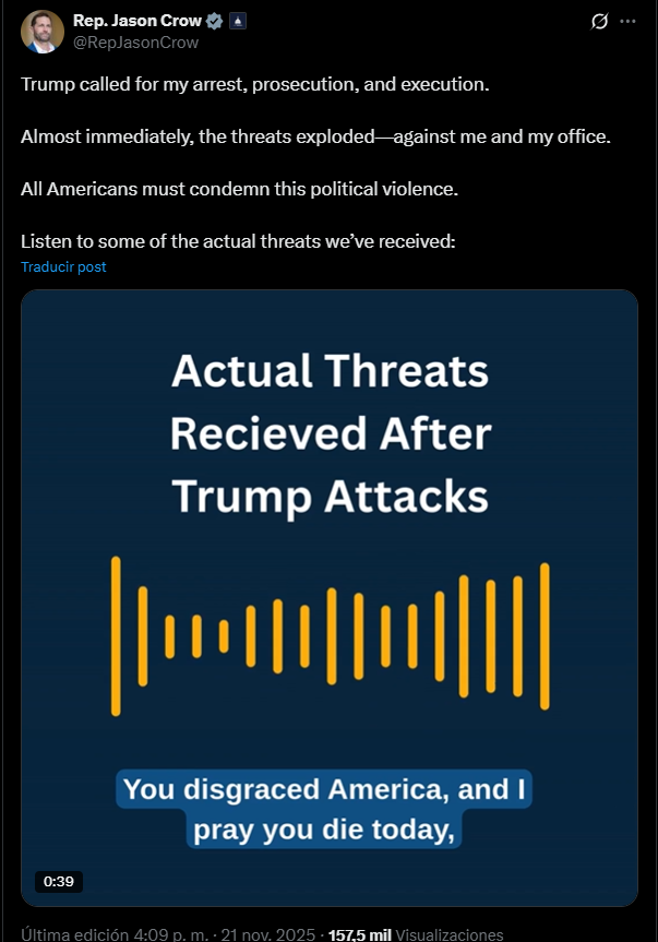 El congresista de Colorado, Jason Crow, le respondió al magnate con un contundente mensaje compartido a través de sus redes sociales, en el que denunció las constantes amenazas que ha recibido, luego de las palabras del mandatario.