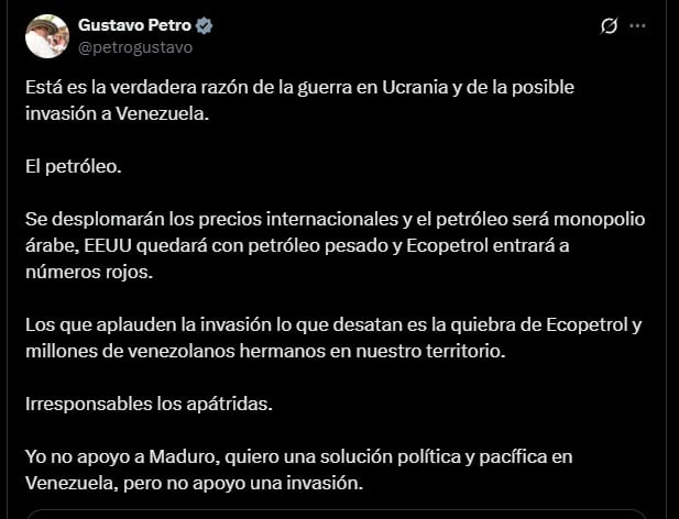 «Los que aplauden la invasión lo que desatan es la quiebra de Ecopetrol y millones de venezolanos hermanos en nuestro territorio», advirtió Petro. «Irresponsables los apátridas», resumió el mandatario, añadiendo que lo que conviene es una solución política y pacífica para Venezuela.