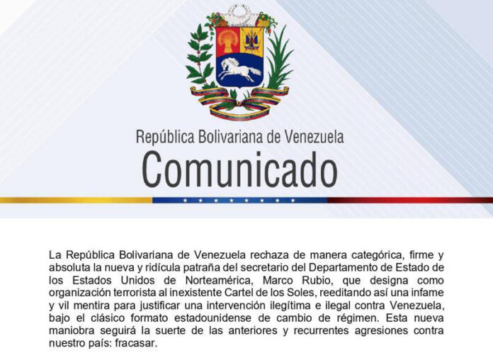 “La República Bolivariana de Venezuela rechaza de manera categórica, firme y absoluta la nueva y ridícula patraña del secretario del Departamento de Estado de los Estados Unidos de Norteamérica, Marco Rubio, que designa como organización terrorista al inexistente Cartel de los Soles, reeditando así una infame y vil mentira para justificar una intervención ilegítima e ilegal contra Venezuela, bajo el clásico formato estadounidense de cambio de régimen. Esta nueva maniobra seguirá la suerte de las anteriores y recurrentes agresiones contra nuestro país: fracasar», señala el citado texto.