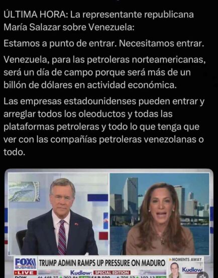 La congresista cubano-estadounidense María Elvira Salazar, ofreció declaraciones a un medio gringo donde deja al descubierto lo que todos los venezolanos sabemos: EEUU quiere entrar a Venezuela por el petróleo.