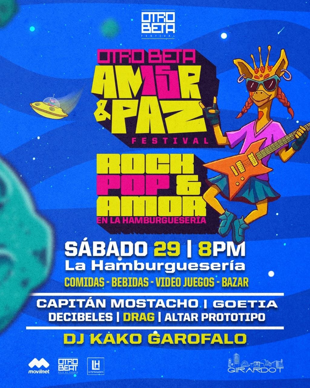 Será el «Rock, pop & amor», a partir de las 8:00 pm en La Hamburguesería. Ese día se presentarán el Capitán Mostacho, Goetia, Decibeles, DRAG y Altar Prototipo. Además, estará como invitado especial el DJ Kako Garofalo.