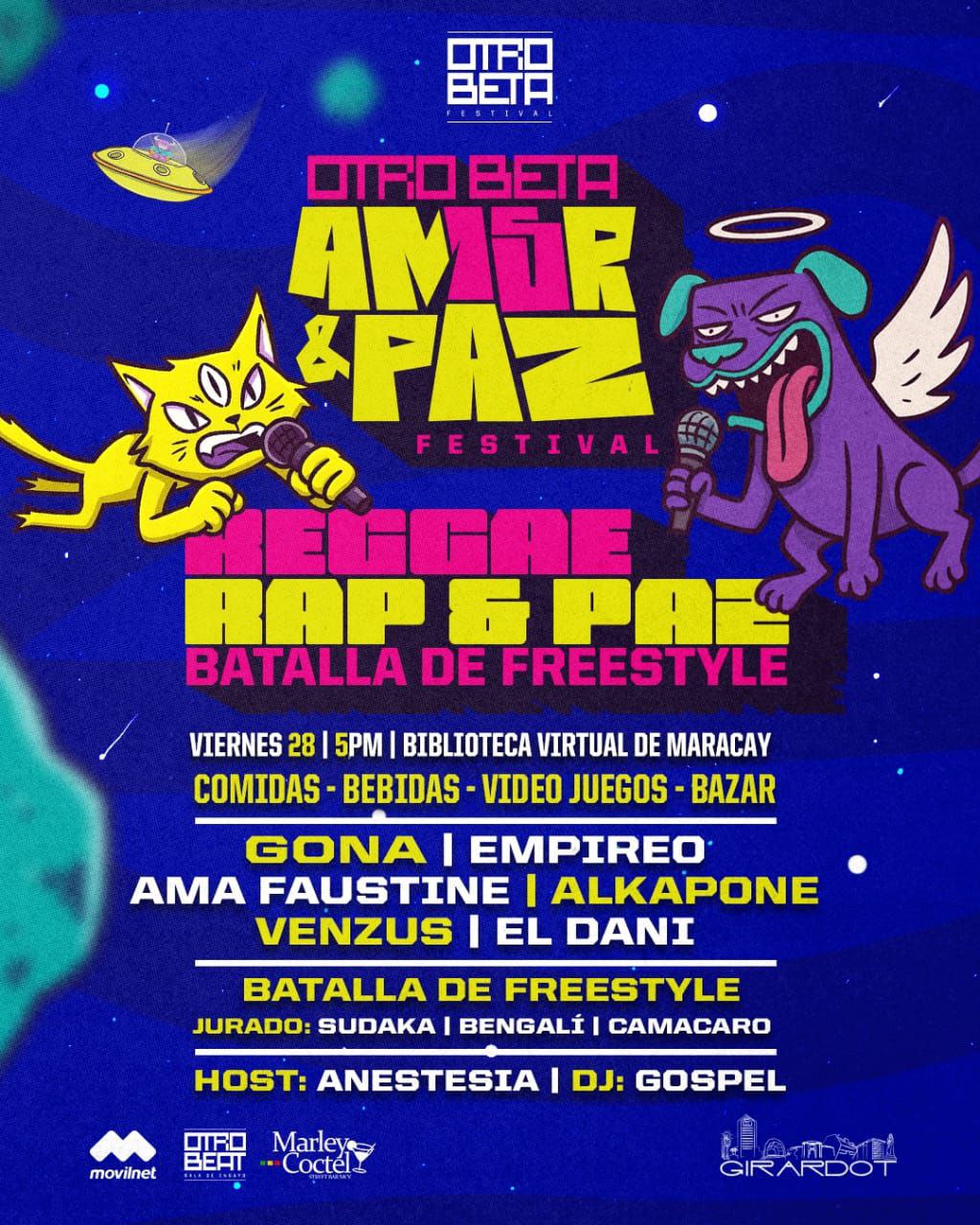Se realizará el «Reggae, rap & paz. Batalla de Freestyle», a partir de las 5:00 pm, en la Biblioteca Virtual de Maracay, donde se presentarán Gona, Empireo, Ama Faustine, Alkapone, Venzus y El Dani. Además, los asistentes contarán con actividades adicionales como comidas, bebidas, videojuegos y bazares.