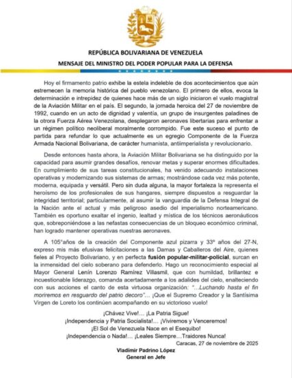El ministro del poder popular para la Defensa, G/J Vladimir Padrino López, envió un saludo y reconocimiento a los integrantes de la Aviación Militar de Venezuela, por conmemorarse este 27 de noviembre el “¡Día de Rebelión Antiimperialista! ¡Día de nuestra heroica Aviación Militar Bolivariana!”.