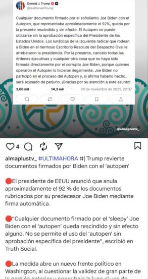 «Cualquier documento firmado por el sleepy Joe Biden con el autopen queda rescindido y sin efecto alguno. No se permite el uso del autopen sin aprobación específica del presidente», escribió Trump en Truth Social.