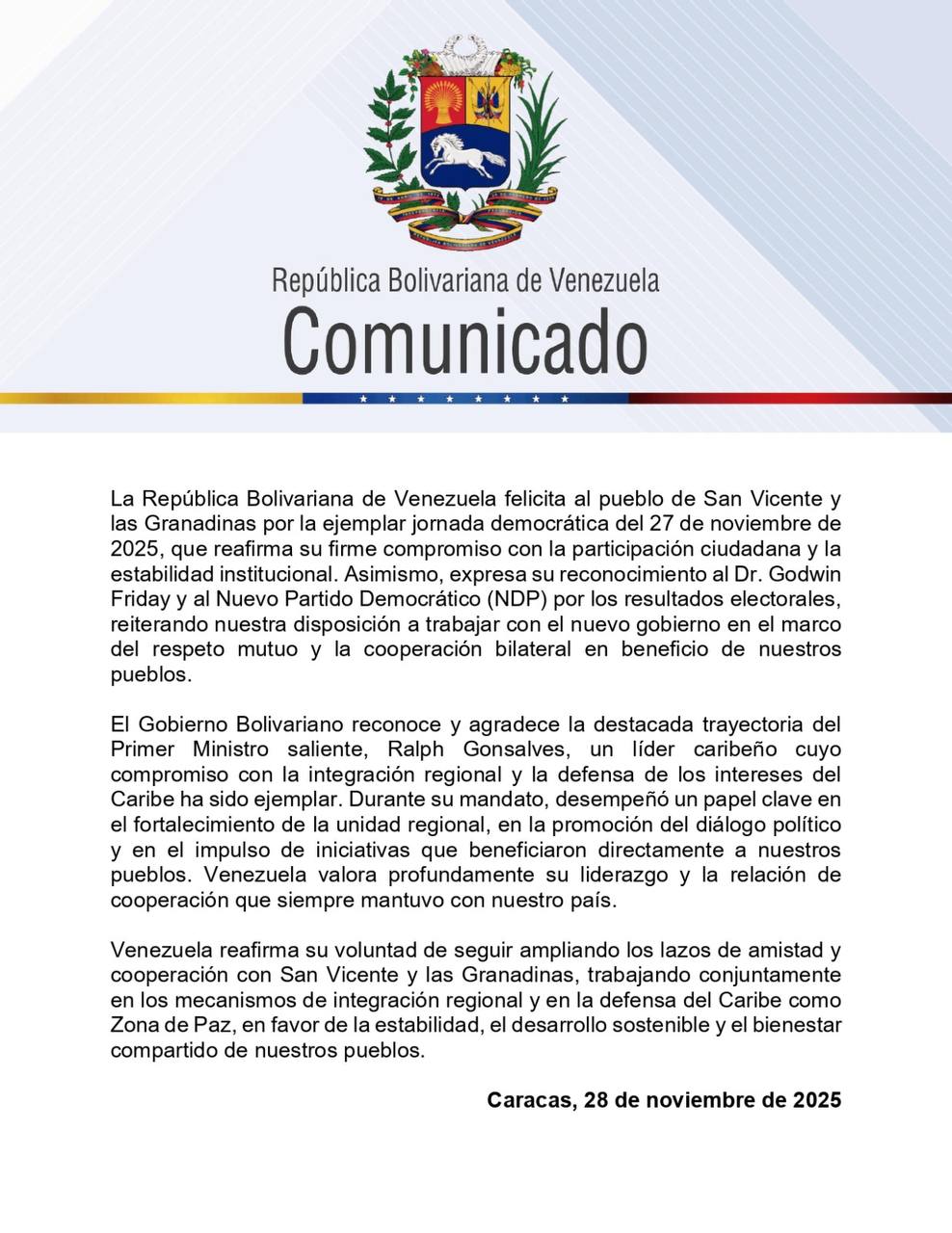 Este viernes el gobierno de la República Bolivariana de Venezuela felicitó al pueblo de San Vicente y las Granadinas por su ejemplar jornada democrática del pasado 27 de noviembre de 2025, donde reafirmaron su firme compromiso con la participación ciudadana y la estabilidad institucional.