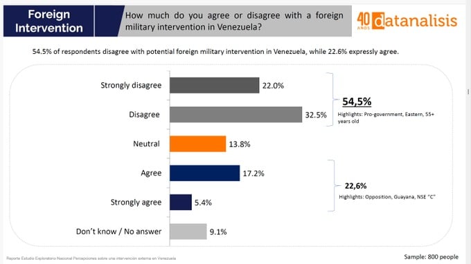 54,5% de los venezolanos está en desacuerdo con una intervención militar extranjera, según una encuesta publicada por Datanálisis, la cual fue realizada entre el 14 y el 19 de noviembre.