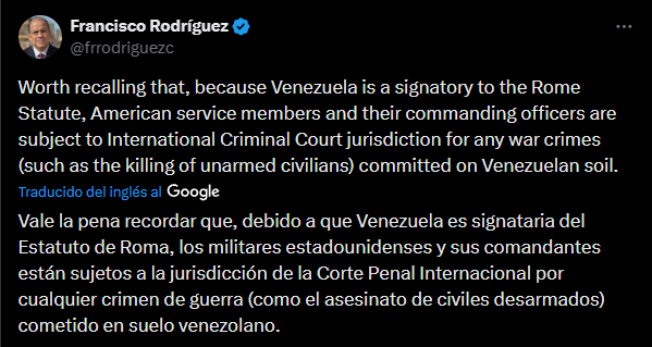 Venezuela es país firmante del Estatuto de Roma, por lo que cualquier acto de agresión contra la nación suramericana, incluido el asesinato de venezolanos por parte de militares estadounidenses, pueden ser catalogados como delitos de guerra por la Corte Penal Internacional, así lo destacó el economista Francisco Rodríguez por medio de una publicación en su cuenta de la red social X.