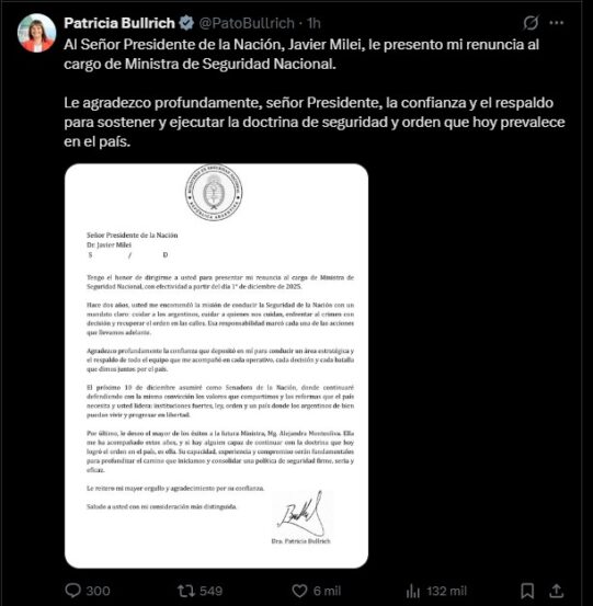 Patricia Bullrich renunció este domingo como ministra de Seguridad Nacional de Argentina, según lo comunicó ella misma en sus redes sociales, junto a una carta dirigida al presidente Javier Milei.