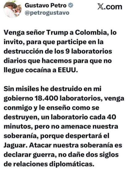 “Venga, señor Trump, a Colombia. Lo invito para que participe en la destrucción de los 9 laboratorios diarios que hacemos para que no llegue cocaína a EEUU”, escribió Petro mediante sus redes sociales.