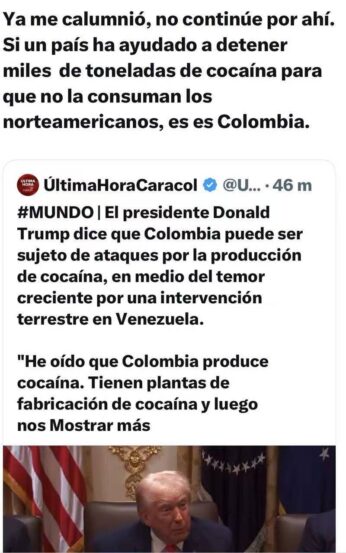 Posteriormente, afirmó: “He oído que Colombia produce cocaína. Tienen plantas de fabricación de cocaína. Y luego nos venden su cocaína. Los apreciamos mucho. Pero sí, cualquiera que haga eso y la venda a nuestro país está expuesto a ataques”.