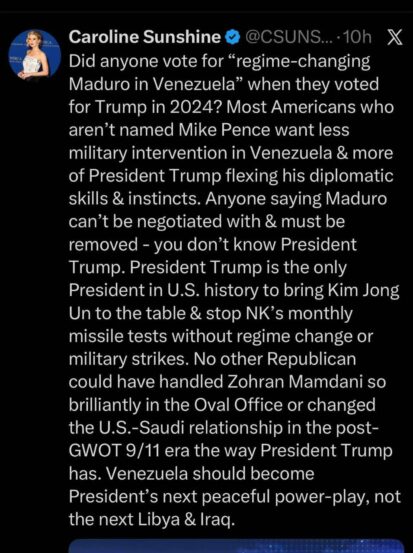 «¿Alguien votó por un cambio de régimen de Maduro en Venezuela cuando votó por Trump en 2024? La mayoría de los estadounidenses que no se llaman Mike Pence quieren menos intervención militar en Venezuela y más que el presidente Trump haga gala de sus habilidades e instintos diplomáticos. Cualquiera que diga que no se puede negociar con Maduro y que debe ser destituido no conoce al presidente Trump», reza parte de su post.