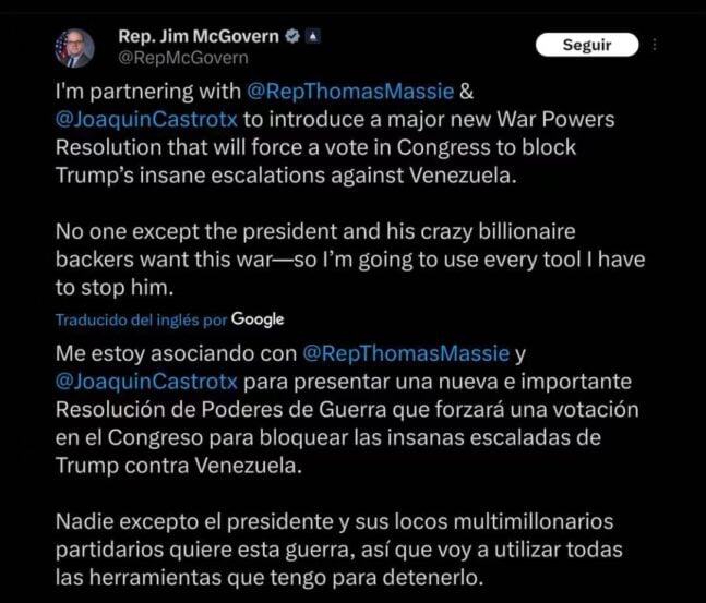 Previamente, Jim McGovern, miembro de la Cámara de Representantes de EEUU, reveló que se estaba asociando con sus pares Thomas Massie y Joaquin Castro para presentar esta misma resolución, la cual, dijo, forzará una votación en el Congreso para bloquear las insanas escaladas de Trump contra Venezuela.