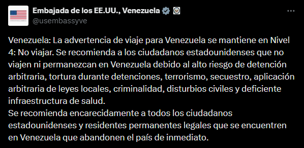 De acuerdo con la información emitida por el Departamento de Estado a través de la página web de su pseudo Embajada en Caracas, la alerta de viaje se mantiene en nivel 4, insistiendo en narrativas de que en el territorio se han hostigado y detenido injustamente a ciudadanos estadounidenses.