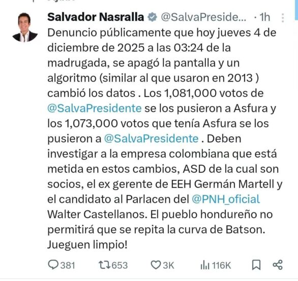En una publicación de X, Nasralla acusó al político David Matamoros, del PNH, de hacer «ingresar» las actas de los departamentos de Olancho, Lempira y Francisco Morazán, «donde los resultados no corresponden a la realidad y están inflados».