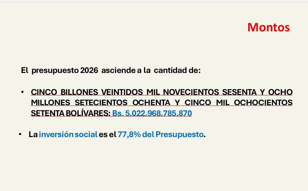 «Queridos diputados y diputadas, el presupuesto previsto para el año 2026 asciende a la cantidad de 5.022.968.785.870 bolívares», resaltó Rodríguez desde la Asamblea Nacional (AN), durante la presentación del proyecto de Ley de Presupuesto para el Ejercicio Económico Financiero de 2026.