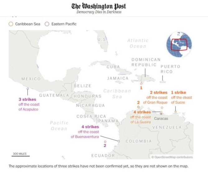 Así lo dio a conocer el medio estadounidense The Washington Post, medio que publicó un mapa donde se muestran los lugares donde se perpetraron los ataques a embarcaciones pesqueras bajo la excusa de una lucha contra el narcotráfico que lleva adelante la administración Trump.