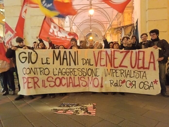 Organizaciones como la Red de Comunistas, sindicatos USB y Nuestra América, así como jóvenes de Cambiare Rotta y Osa manifestaron que «Venezuela se respeta» y exigieron el cese de la injerencia contra la nación suramericana, así como la retirada de las tropas norteamericanas del Caribe, donde han destruido embarcaciones y asesinado vilmente a decenas de personas inocentes.