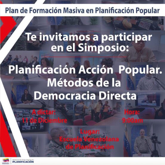 En el marco del Plan de Formación Masiva en Planificación Popular, la Vicepresidencia Sectorial de Planificación realizará el Simposio “Planificación Acción Popular. Métodos de la Democracia Directa”, el próximo jueves 11 de diciembre del 2025.