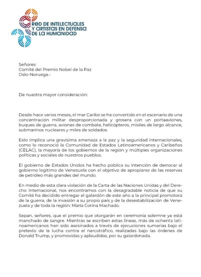 “Su Comité ha decidido entregar el galardón de este año a la principal promotora de la guerra, de la invasión a su propio país y de la desestabilización de Venezuela y de toda la región: María Corina Machado. Sepan, señores, que el premio que otorgarán en ceremonia solemne ya está manchado de sangre”, indican los intelectuales en el texto.