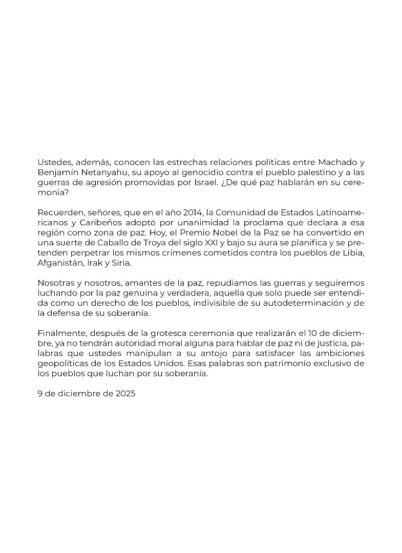 Finalmente, después de la grotesca ceremonia que realizarán el 10 de diciembre, ya no tendrán autoridad moral alguna para hablar de paz ni de justicia, palabras que ustedes manipulan a su antojo para satisfacer las ambiciones geopolíticas de los Estados Unidos. Esas palabras son patrimonio exclusivo de los pueblos que luchan por su soberanía.