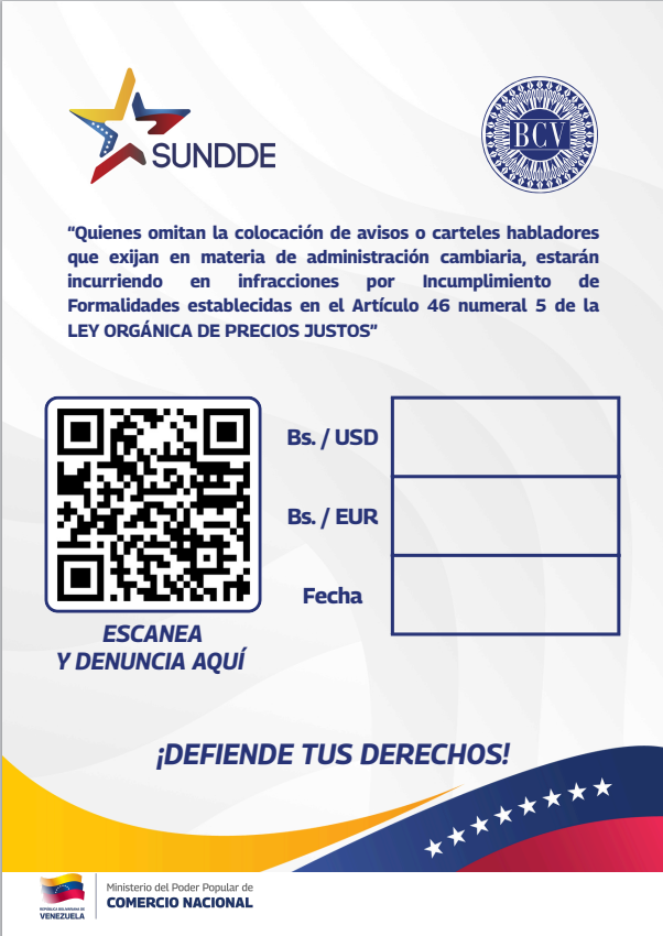 La Superintendencia Nacional para la Defensa de los Derechos Socioeconómicos (Sundde) implementó un nuevo formato obligatorio para la divulgación del valor del dólar y el euro en todos los comercios del país.