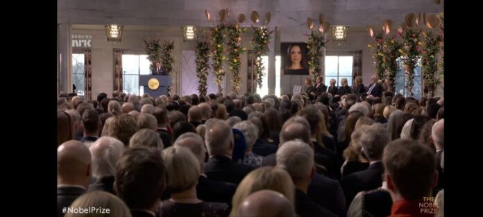 El Comité Noruego del Premio Nobel de la Paz montó toda una escenografía que evoca un verdadero funeral en el marco de la ceremonia de entrega del galardón, que este 2025 decidieron adjudicarlo a la militante ultraderechista venezolana María Corina Machado.
