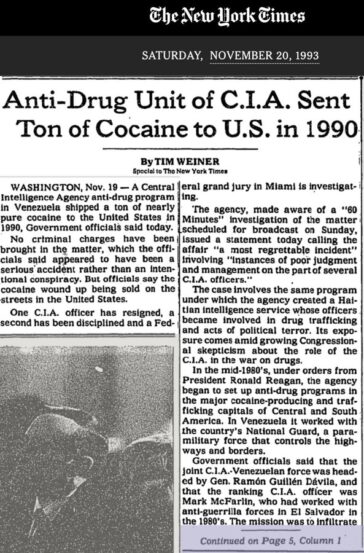 Blumenthal compartió un artículo del New York Times publicado el 20 de noviembre de 1993, el cual reseña que la unidad de la CIA en Venezuela para ese entonces transportó los estupefacientes y que el gobierno estadounidense no presentó cargos contra ninguno de los involucrados, mientras que esta era vendida en su país.