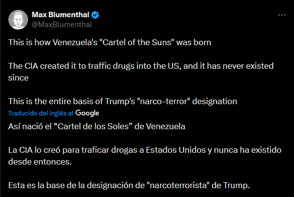 El periodista estadounidense Max Blumenthal reveló detalles sobre lo que sería el verdadero origen de la narrativa del llamado «Cártel de los Soles», en la cual el presidente Donald Trump se justificó para llevar a cabo operaciones militares en el mar Caribe, resultando en el asesinato de personas inocentes y, recientemente, en el secuestro de un buque petrolero.