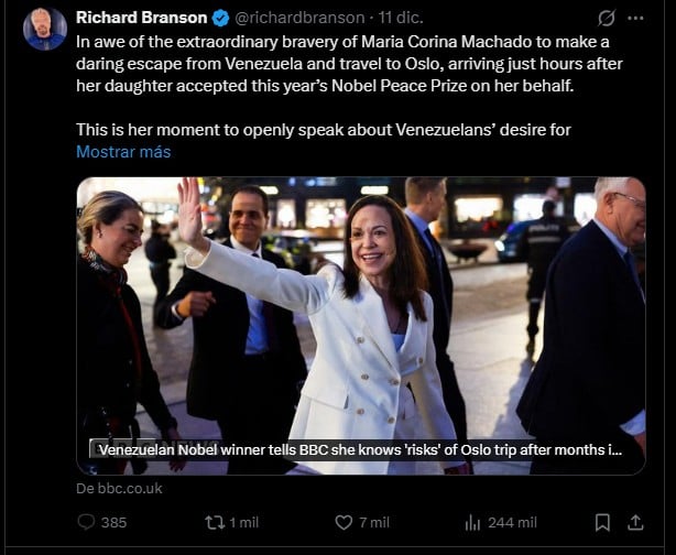 Recientemente, Branson saludó en su cuenta de X a la extremista María Corina Machado, en un mensaje donde le expresó su admiración por haber podido salir de Venezuela. “Impresionado por la extraordinaria valentía de María Corina Machado al hacer un atrevido escape de Venezuela y viajar a Oslo”, publicó.