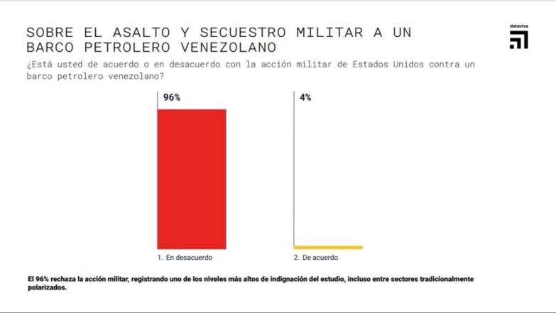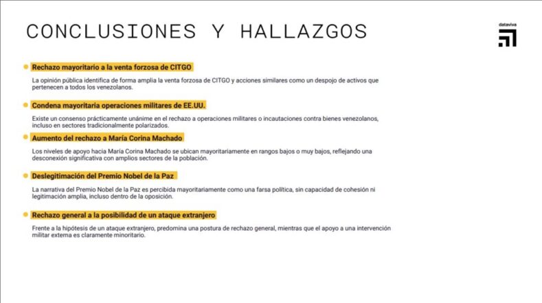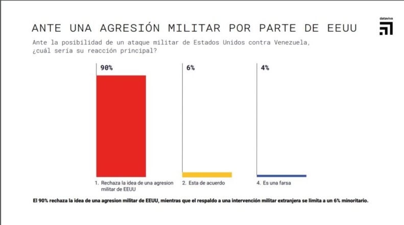 Estos indicadores se desprenden de la encuesta nacional de la firma DataViva, en la cual se evidencia un abierto rechazo a cualquier agresión contra Venezuela, lo que constituye uno de los niveles más altos de consenso observados en este tipo de estudios.