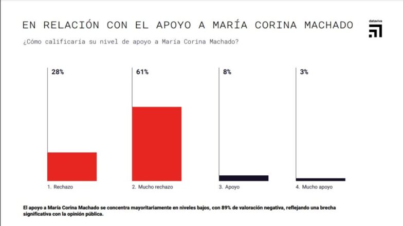 Los resultados también mostraron el incremento en el rechazo, así como una caída sostenida del apoyo a María Corina Machado, que se refleja en la respuesta de 89% de los entrevistados, en contraposición al 11% expresó su apoyo o mucho apoyo a la extremista.