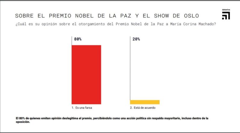 Al consultar sobre la percepción de los venezolanos sobre el otorgamiento del Premio Nobel a Machado, 80% de los entrevistados lo considera como una “farsa” y lo vincula con estrategias políticas de sectores radicales de la oposición.