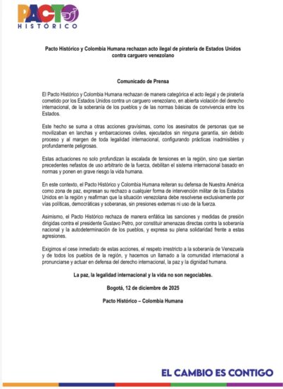 El Pacto Histórico y Colombia Humana emitieron un comunicado a la comunidad internacional en rechazo de los actos de piratería cometidos por Estados Unidos contra un buque con petróleo venezolano, en abierta violación al derecho internacional, la soberanía de los pueblos y las normas básicas de convivencia entre los Estados-naciones.