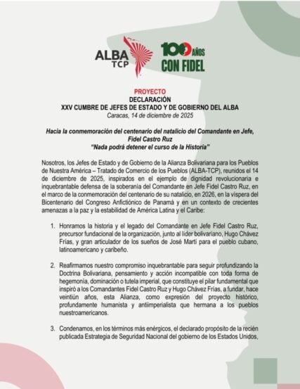 Nosotros, los Jefes de Estado y de Gobierno de la Alianza Bolivariana para los Pueblos de Nuestra América – Tratado de Comercio de los Pueblos (ALBA-TCP), reunidos el 14 de diciembre de 2025, inspirados en el ejemplo de dignidad revolucionaria e inquebrantable defensa de la soberanía del Comandante en Jefe Fidel Castro Ruz, en el marco de la conmemoración del centenario de su natalicio, en 2026, en la víspera del Bicentenario del Congreso Anfictiónico de Panamá y en un contexto de crecientes amenazas a la paz y la estabilidad de América Latina y el Caribe: