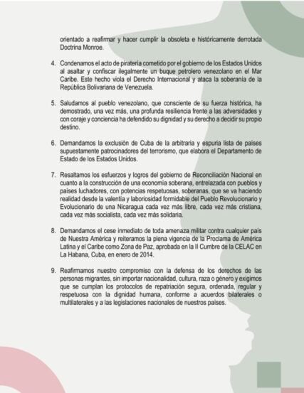 - Demandamos el cese inmediato de toda amenaza militar contra cualquier país de Nuestra América y reiteramos la plena vigencia de la Proclama de América Latina y el Caribe como Zona de Paz, aprobada en la II Cumbre de la CELAC en La Habana, Cuba, en enero de 2014.