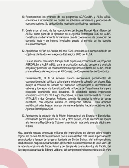 Paralelamente, el ALBA activará nuevos mecanismos permanentes de cooperación social, política y cultural para fortalecer la cohesión del bloque. Esto incluye la creación del circuito de formación comunal, para el intercambio de saberes y liderazgo, y la formalización de una fuerza de tarea para respuesta coordinada ante desastre.