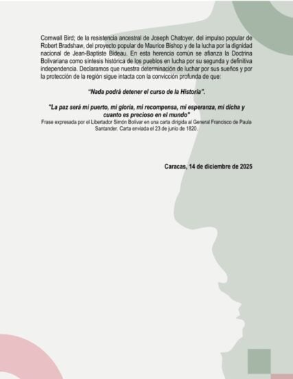 “En esta herencia común se afianza la Doctrina Bolivariana como síntesis histórica de los pueblos en lucha por su segunda y definitiva independencia que brille para todo el mundo. Declaramos que nuestra determinación de luchar por sus sueños y por la protección de la región sigue intacta con la convicción profunda de que: ‘La paz será mi puerto, mi gloria, mi recompensa, mi esperanza, mi dicha y cuanto es precioso en el mundo’ (Reflexión de Bolívar en 1820)», refiere la declaración consignada por las naciones adscritas al ALBA-TCP durante la noche de este viernes 12 de diciembre.