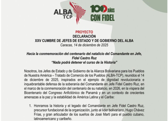 Nosotros, los Jefes de Estado y de Gobierno de la Alianza Bolivariana para los Pueblos de Nuestra América – Tratado de Comercio de los Pueblos (ALBA-TCP), reunidos el 14 de diciembre de 2025, inspirados en el ejemplo de dignidad revolucionaria e inquebrantable defensa de la soberanía del Comandante en Jefe Fidel Castro Ruz, en el marco de la conmemoración del centenario de su natalicio, en 2026, en la víspera del Bicentenario del Congreso Anfictiónico de Panamá y en un contexto de crecientes amenazas a la paz y la estabilidad de América Latina y el Caribe: