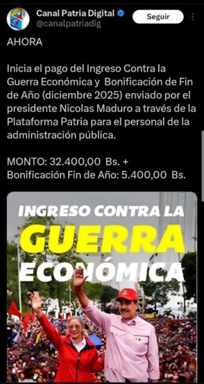 Este lunes 15 de diciembre inicia el pago del Ingreso Contra la Guerra Económica y Bonificación de Fin de Año (diciembre 2025) enviado por el presidente de la República, Nicolás Maduro, a través de la Plataforma Patria.